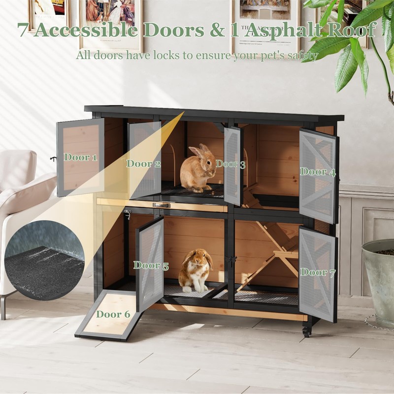 TIMHAKA 2 Story Rabbit Cage with Run, 47.3" Indoor & Outdoor Rabbit Hutch, Bunny Cage for Guinea Pig, Wooden Design with 2 Removable Tray, Waterproof Roof & 4 Metal Wheels for Small-Medium Animals