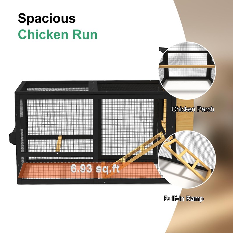 - Safety Doors Design: We have 5 doors for your pets to enter and exit. The main rest area has one door. The chicken run is equipped with three doors. There is a sliding door between the ramp and the resting box. Both exterior doors are equipped with locks. Say goodbye to predators. You don't need to worry about the safety of your chickens anymore.