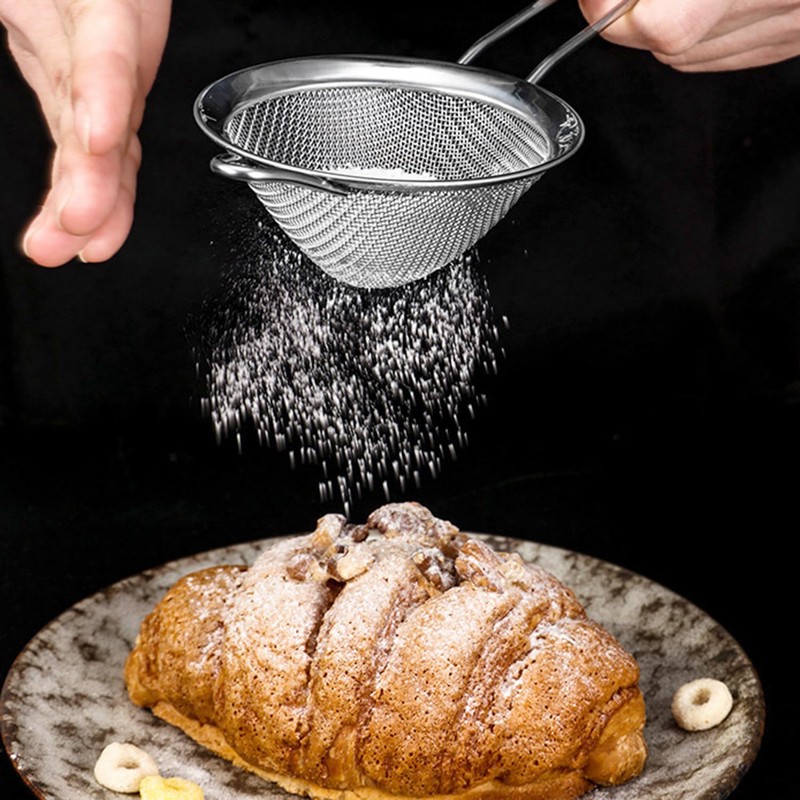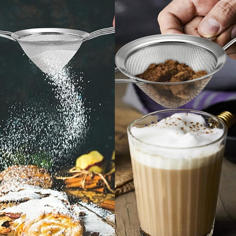 Many Uses:Fine Mesh Strainers can regard as a flour sifter to sieve flour, powdered sugar and bran in wheat. The small strainer is perfect for tea, quinoa or coffee.