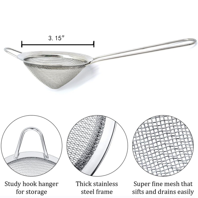 • Material and Size:Made from high-quality, food-grade 304 stainless steel. This strainer features a sturdy outer framework and handle. Size of this Cone Strainer is about 3.15inch.