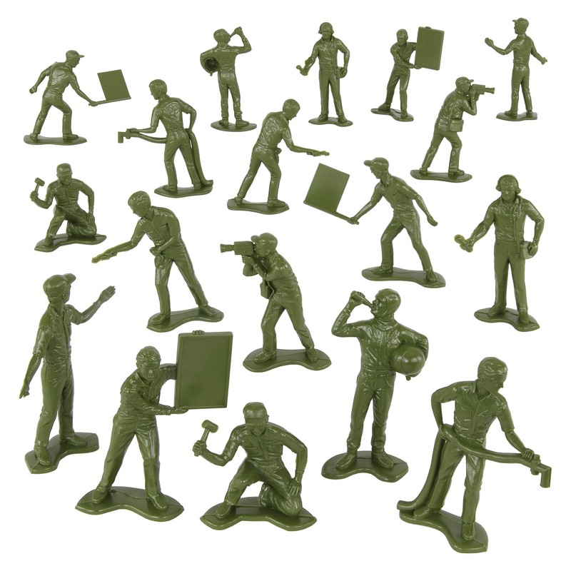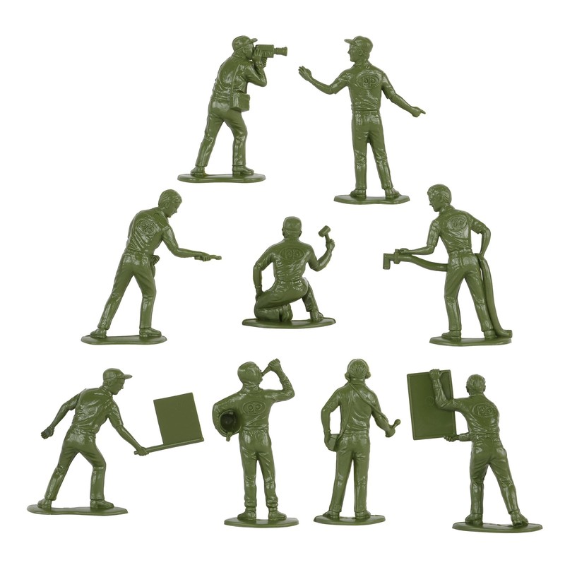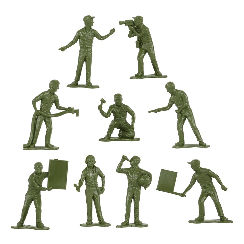 Specialists and Support Crews for your Plastic Army are ready for action. This Set of 18 Tim Mee Toy Plastic Army Men is proudly manufactured in the United States, and includes OD-Green troops in 9 poses for maximum play value. Features test pilot, mechanics, ground crew, and even a film and sound crew. Figures stand up to 2.5 inches tall and are approximately 1:32 scale. Made from slightly flexible LDPE plastic with medium detail, and a little flashing.