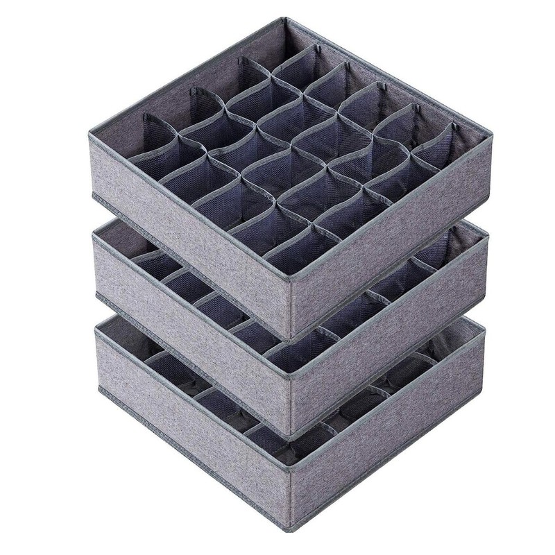 - DISEÑO ÚNICO: Nuestro organizador para closet triple mide 12.5 x 12.5 x 4 pulgadas cada uno. Dos de las cajas tienen 24 celdas medianas, una de ellas tiene 16 celdas grandes para almacenar calcetines de invierno/atléticos,Color: Gris.