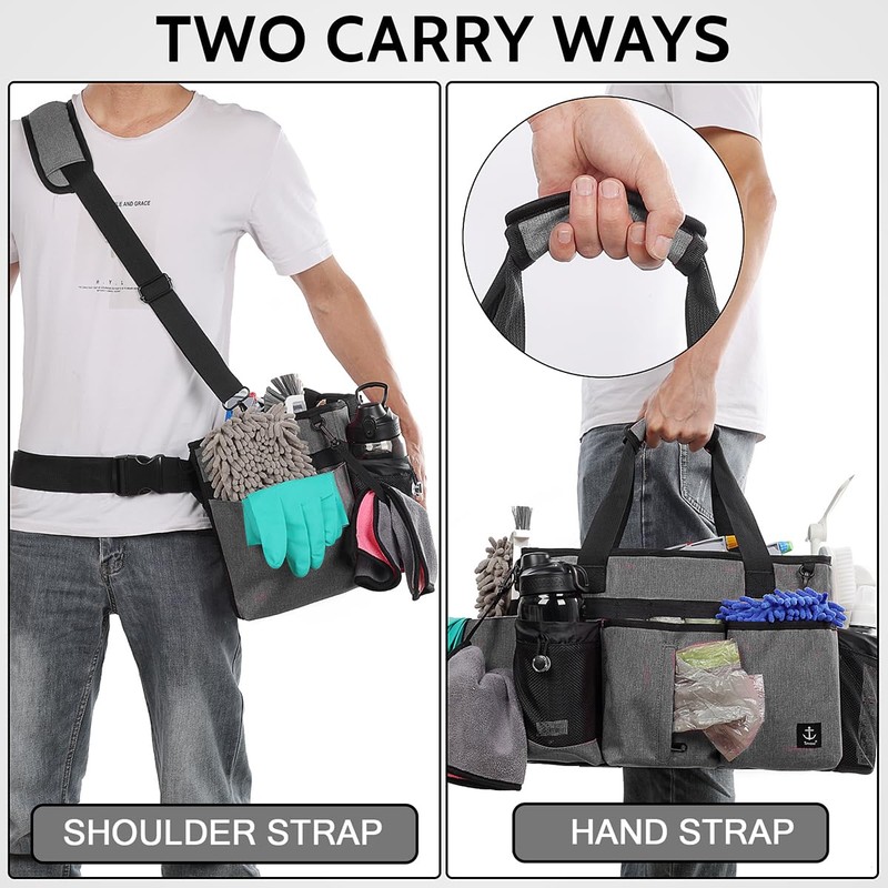 Timoxi Large Wearable Cleaning Caddy Bag with Detachable Divider, Cleaning Organizer with Handles, Cleaning Supply Tote with Adjustable Shoulder Strap&Waist belt for Cleaners & Housekeeper (Grey)
