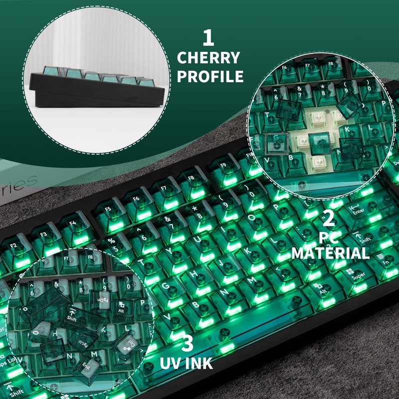 - PC Material: The green transparent keycaps are made of high-quality PC material, with high transparency, wear-resistant, high toughness, and has a good feel, strong transparency makes it become a special material for LED light diffusion, which can make your mechanical keyboard look cooler