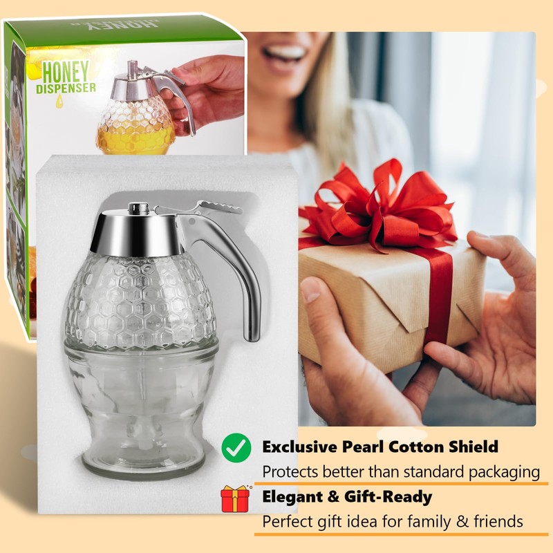 - Keeps Honey Fresh and Delicious: Crafted from durable, high-quality glass with a food-grade ABS plastic release lever, our dispenser includes an airtight stopper to keep your honey fresh. Unlike metal levers, the ABS lever won't react with honey, preserving its natural quality. Additionally, our exclusive pearl cotton shield provides superior protection for safe delivery.