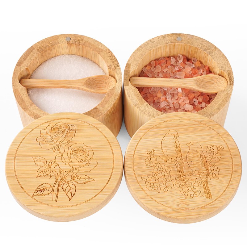 Timtopno Salt Cellar, 2PCS Salt Container Bamboo Salt and Pepper Box for Countertop with Built-in Spoon & Swivel Lid, Spice Seasoning Storage Bowl, Elegant Salt Holder (Rose & Bird Engraving)