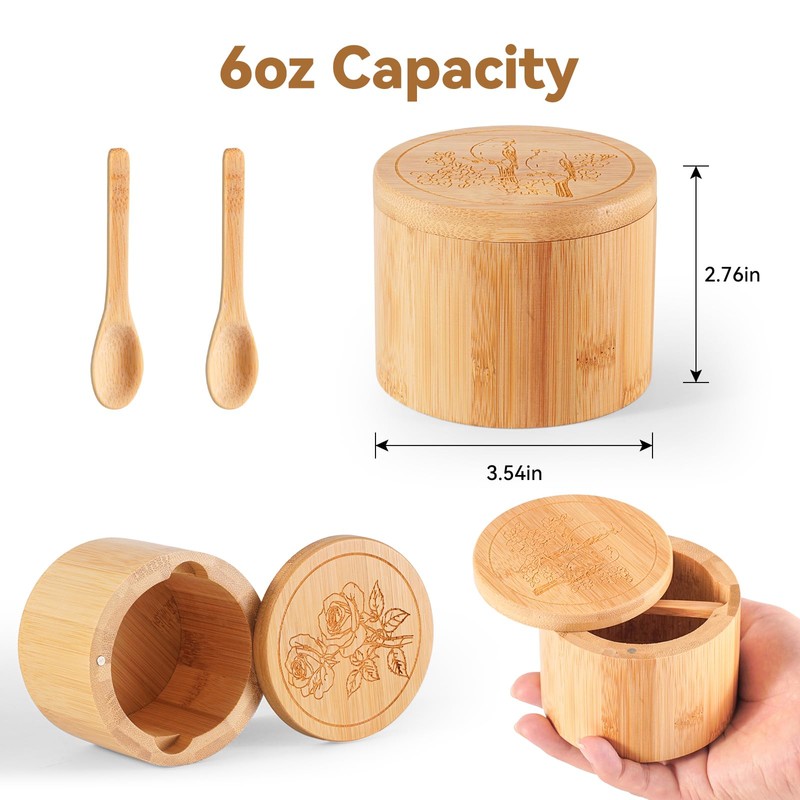 - Convenient Set of 2 Salt Boxes with Built-in Spoons: No more searching for a spoon! This bamboo salt cellar set includes two 6oz containers, each with a built-in slot to keep the spoon clean, dustproof, and always ready for use, eliminating the hassle of salt residue on the lid caused by external spoons. Perfect for organizing salt, pepper, sea salt, and other spices on your countertop or dining table.