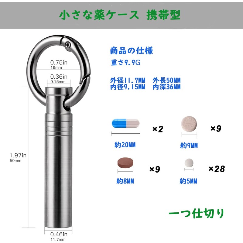 - Pill case size: Inner diameter approx. 0.4 inches (9 mm), Outer diameter approx. 0.4 inches (11 mm), Total length of outside 2.0 inches (50 mm), Weight: 0.4 oz (10 g) (including key ring