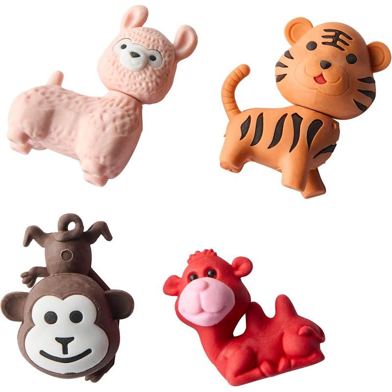 WILD ANIMAL THEME ERASERS - The collection includes a Llama, Tiger, Monkey and Camel, all packed in an eraser box - Liven up your pencil case with this wild eraser collection!