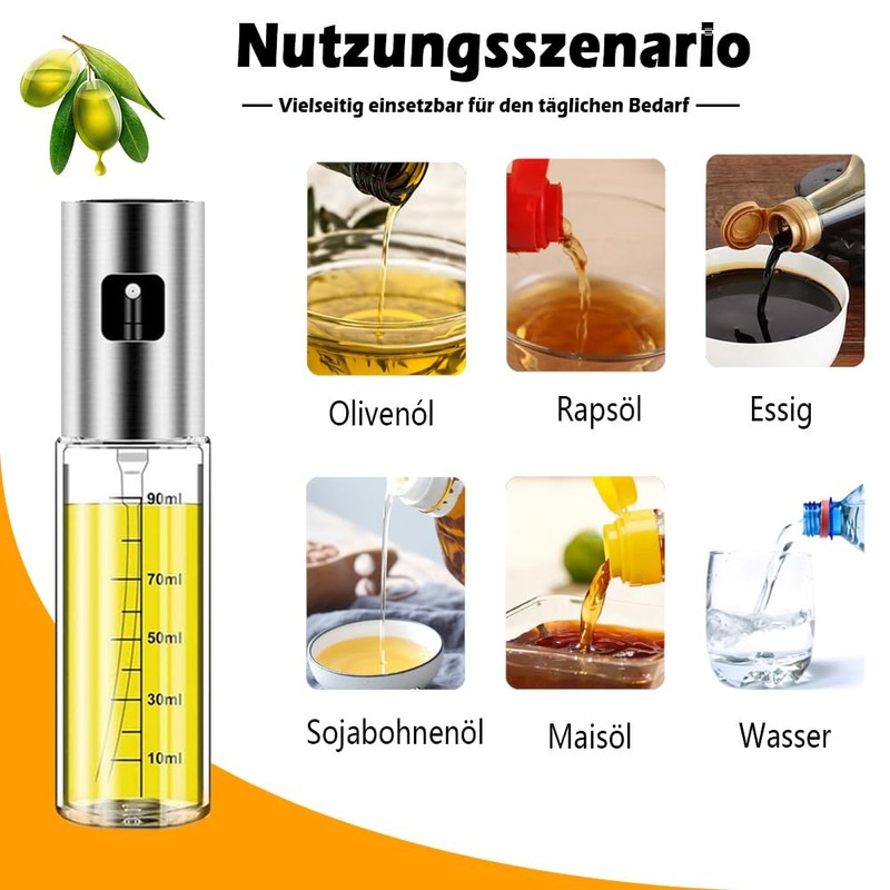 - Versatile oil sprayer: the oil sprayer can be filled with olive oil, sunflower oil, vinegar and other liquids. Perfect for spraying instead of using a brush when frying, sautéing, baking, cooking, ideal for reducing the oil used when frying food.