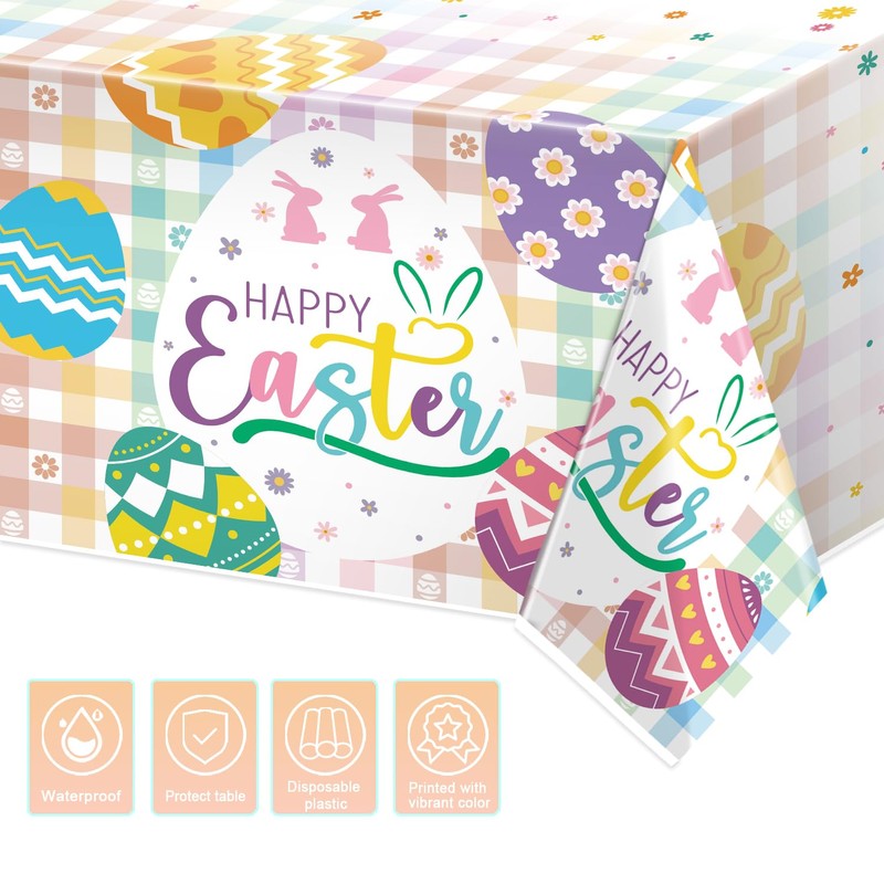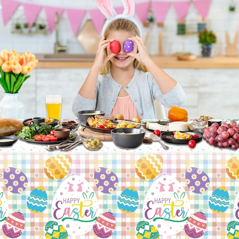 tineit Easter Tablecloth, Happy Easter Eggs Disposable Tablecloths for Easter Decorations, Easter Plastic Tablecloth Rectangle for Spring Easter Party Table Decor, Easter Buffalo Plaid Table Cover