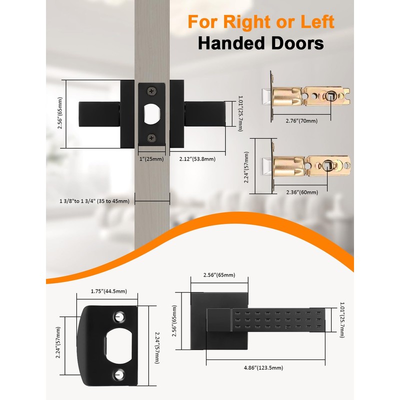 - DIMENSIONS: Fits doors thickness: 1-3/8 inch to 1-3/4 inch (35mm to 45mm). Handle Length: 4-4/5"(123mm); Adjustable Latch: 2-3/8" or 2-3/4" (60 or 70mm) backset.