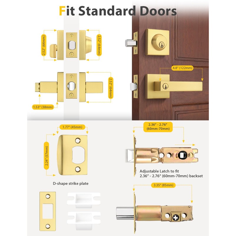 - EASY INSTALLATION: Fits most standard doors. All you need is just a screwdriver, no wiring and no professional locksmith. Fit all doors 1-3/8" to 1-3/4" (35mm to 45mm) thick. Adjustable Latch with 2-3/8" to 2-3/4"(60 or 70mm) backset.