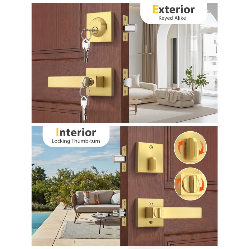 - KEYED ALIKED DOOR LOCK AND SINGLE DEADBOLT: Lockset as a unit, lock/unlock by the same key outside and locked inside with thumb-turn button. Ideal for exterior/entry/front doors where keyed entry/security needed.