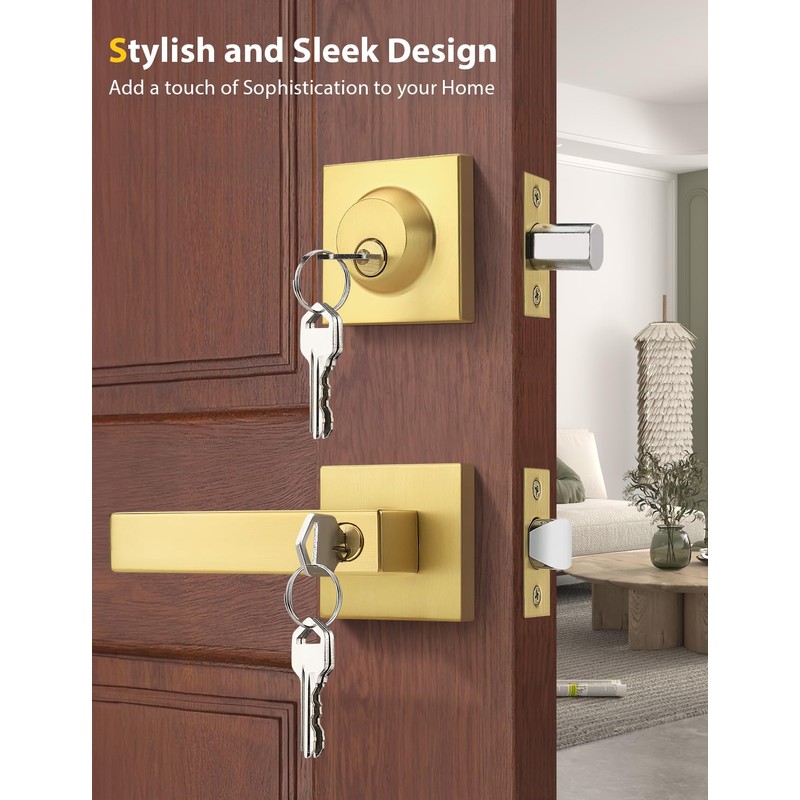 Tinewa 5 Pack Brushed Gold Keyed Alike Front/Exterior Door Lever with Single Cylinder Deadbolt, Satin Brass Entry Door Knob Lock Set Combo Sets, for Entrance/Front and Office Doors