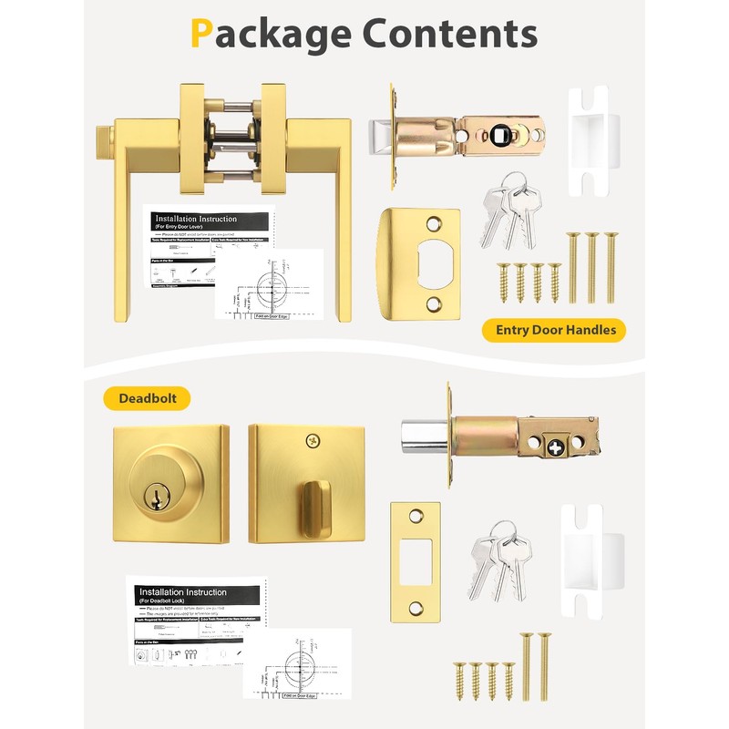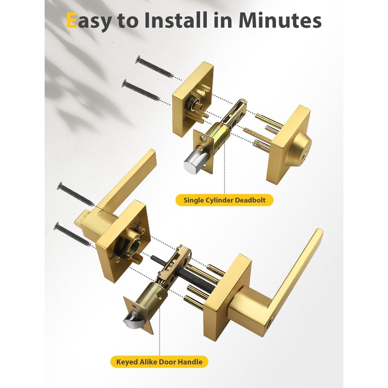 - DURABLE DOOR HANDLE: Tinewa heavy-duty privacy door handle adopts premium quality zinc alloy, advanced electroplating brushed gold finish with high-strength anti-corrosion ability.Conformed with ANSI Grade 3 Exceeds 250,000 cyles and 5 pins brass tumbler cylinder;Solid Column security bolt for anti-sawing protection