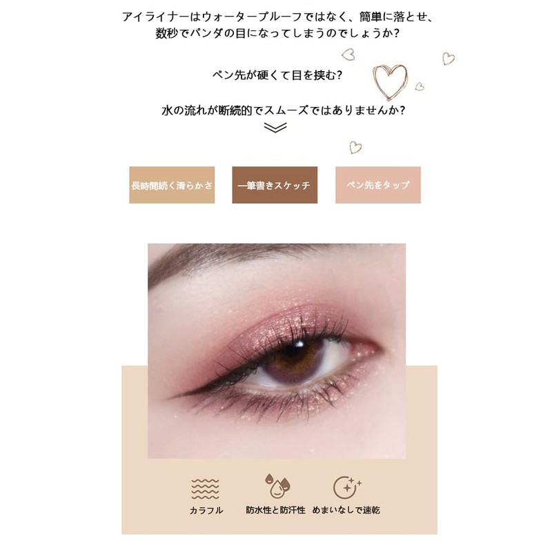 - 4. 濃密な発色でくっきりとした美しいラインを実現 - 1塗りで鮮やかな発色、何度も重ね塗りする必要なし - ブラックは深みのある真っ黒で、目を引き締める効果 - ブラウン系は自然な印象でナチュラルメイクに最適 - 発色ムラがなく、均一なカバー力 - 光沢/マットなど、好みの仕上がりが選べるラインナップ