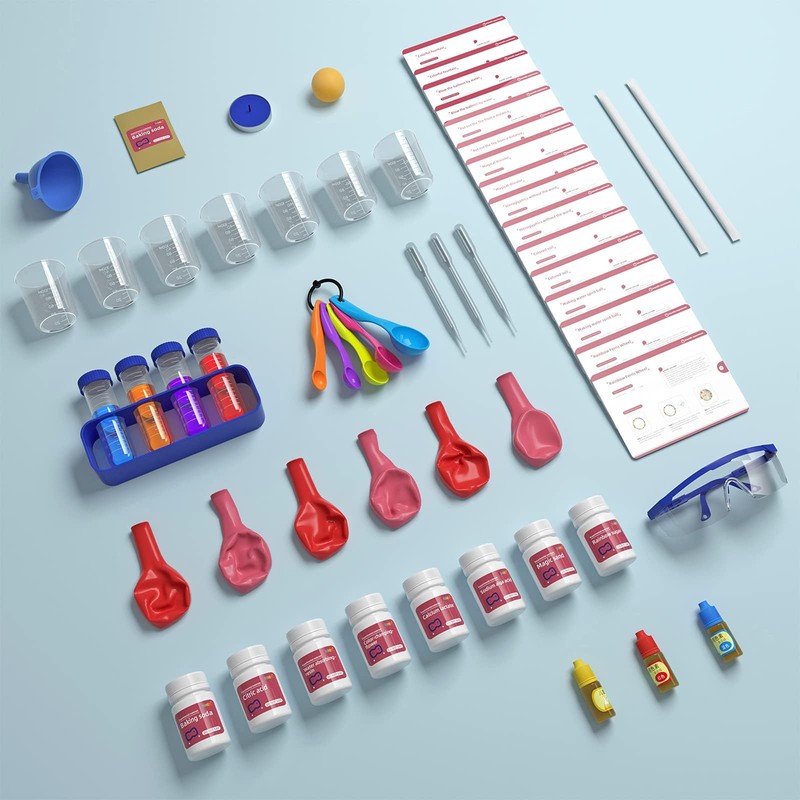 - Complete 47-pieces Science Test Kit - We provide safe and durable scientific tools for 30+ experiments, including 1 goggles, 8 bottles of chemical materials, 4 large test tubes with scales, 5 measuring spoons, 7 measuring cups, 1 funnel, 3 droppers, 6 balloons, 1 table tennis, 1 candle, etc. (Water and oil are not included)