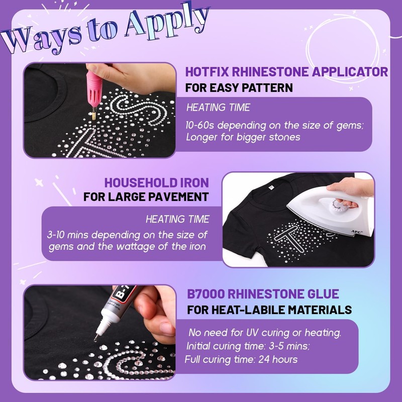 - EASY TO USE -- The flat back hotfix rhinestone is designed with hot melt glue. You can use hotfix rhinestone applicator or an iron to fix the rhinestones on the clothes, or you can use glue to fix them