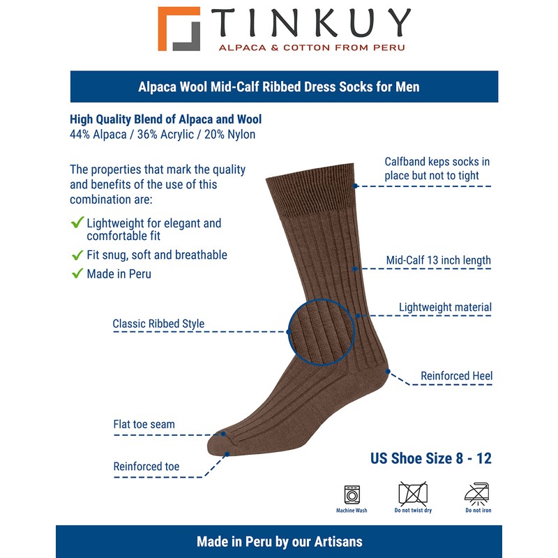 - Elegant and Sophisticated Men’s Dress Socks: Dress for any occasion with a pair of stylish ribbed socks for men. TINKUY PERU’s wool socks are lightweight, breathable and comfortable, featuring a reinforced heel and toe to withstand daily wear. Sizes range from US Adults size 8-12.