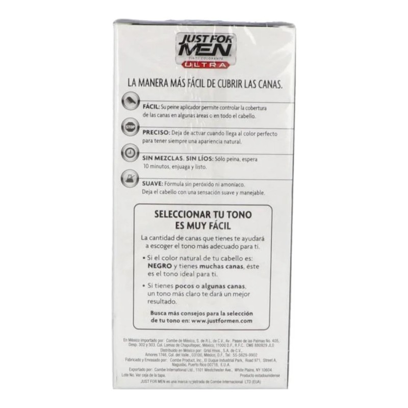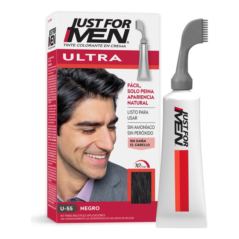 ¡Consigue un cabello sin canas y con un negro intenso que realza tu look! Con el Tinte de Cabello Just For Men Ultra Negro, la confianza en tu apariencia está garantizada.