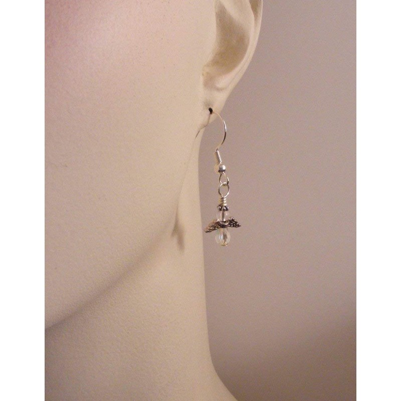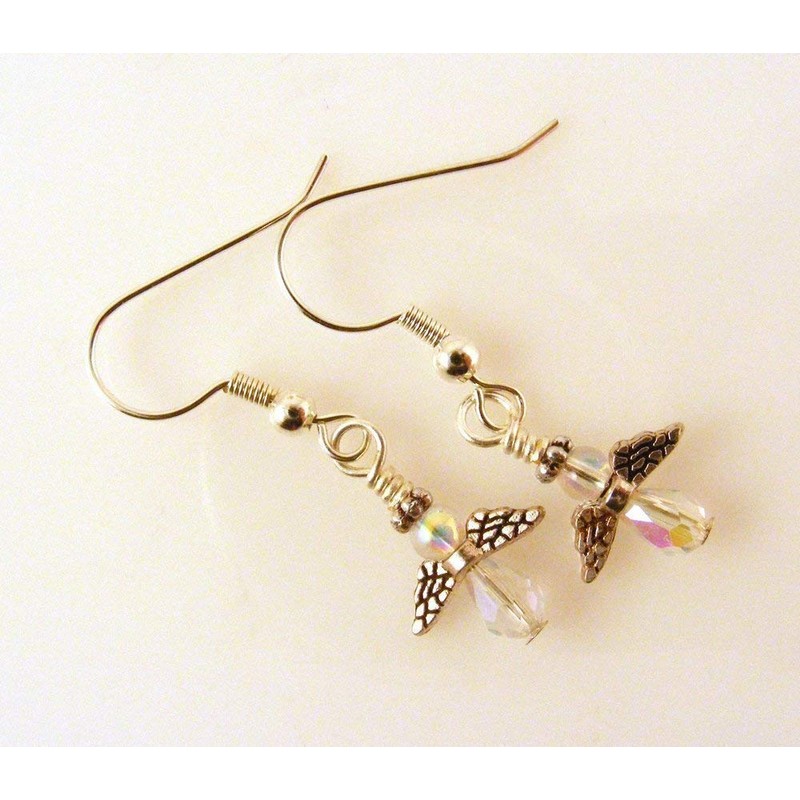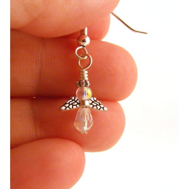 These tiny angel earrings feature faceted crystal bead bodies that have an AB (Aurora Borealis) finish which casts a pastel colored flash when the light hits the facets. The bead used in the head also has an AB finish, but it is not faceted. The angel wings are very detailed and are silvertoned base metal. A silvertoned metal daisy beads sits on top of the head as the halo. These cute little angelic earrings dangle 1 1/2" from Sterling silver fish hook or French style ear wires. These are cute to wear during Christmas!