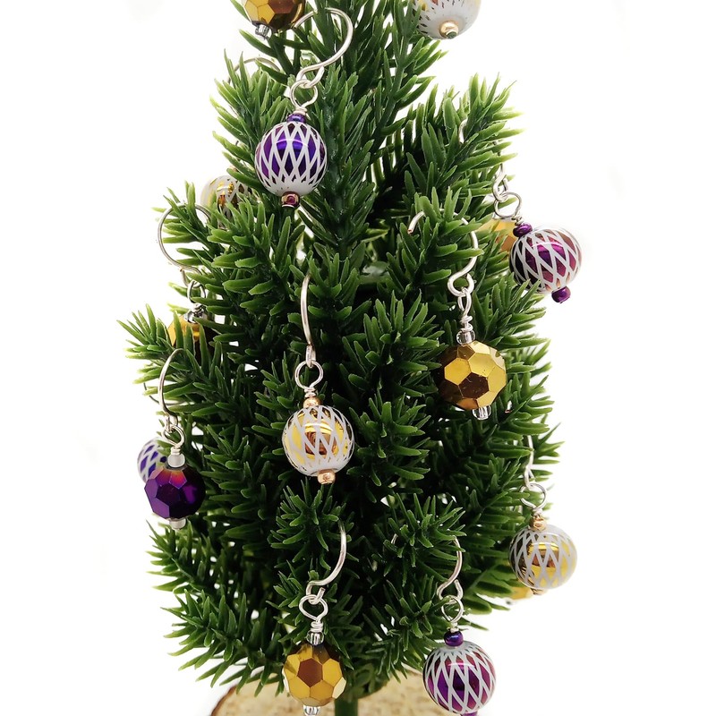 Tiny Christmas Tree with Removable Miniature Ornaments, Purple and Gold Glass Baubles for Dollhouse, 6.5 in tall