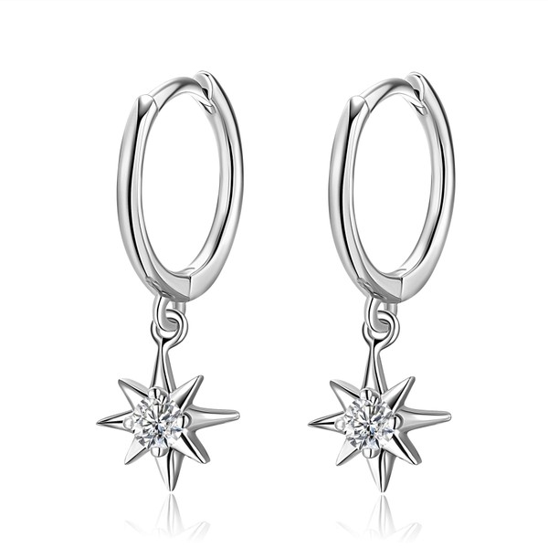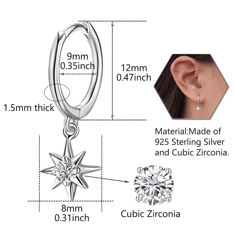 Tiny Cubic Zirconia Dangle Huggie Hoop Earrings Sterling Silver Hoop Earrings with Starburst Charms Cartilage Helix Hoop Hinged Sleeper Earrings