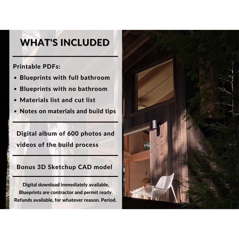 WHAT’S INCLUDED: Instantly available download includes two sets of printable PDF blueprints (with, and without a bathroom), a materials list, a cut list, notes on materials and build tips, a digital album of 600 photos and videos of the build process, and a bonus 3D Sketchup model of the cabin.