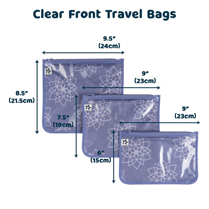 Tiny Twinkle Mess-proof Travel Bags, Airline Compliant, Zipper Closure, Clear Front Pouch, Diaper Bag Packing, Toiletry or Cosmetics Organizer 3 Pack Set (Lotus)