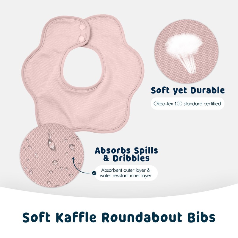 This set features three soft, absorbent and water repellant, roundabout bibs. Versatile, roundabout design allows the bib to work for multiple feedings, simply rotate the bib to find a new clean spot once it gets messy! The signature Kaffle fabric surrounds both an absorbent fleece and a waterproof inner layer making sure the bibs soak up messes without soaking through! For ages 3 months and up.