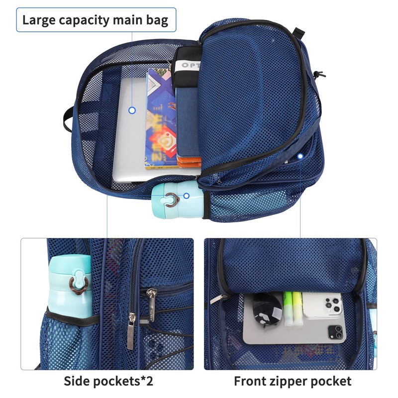 - 【Large Capacity】 Mesh backpack size is 12*5.3*17 inches, 1 main pocket for books, magazines, iPad, etc.; 2 zippered front pockets. 2 side mesh pockets for water bottles and umbrellas, with plenty of storage space.
