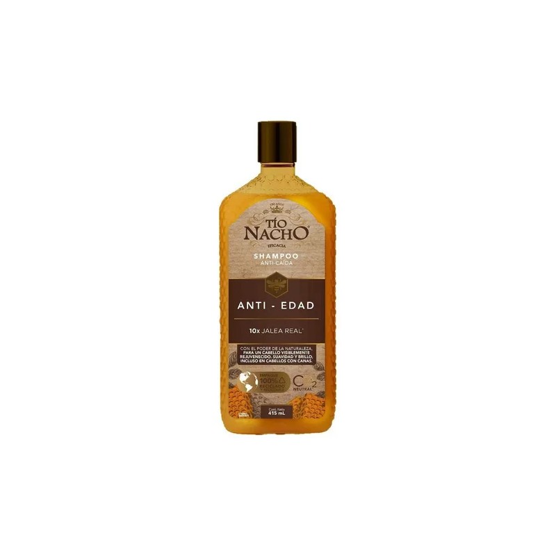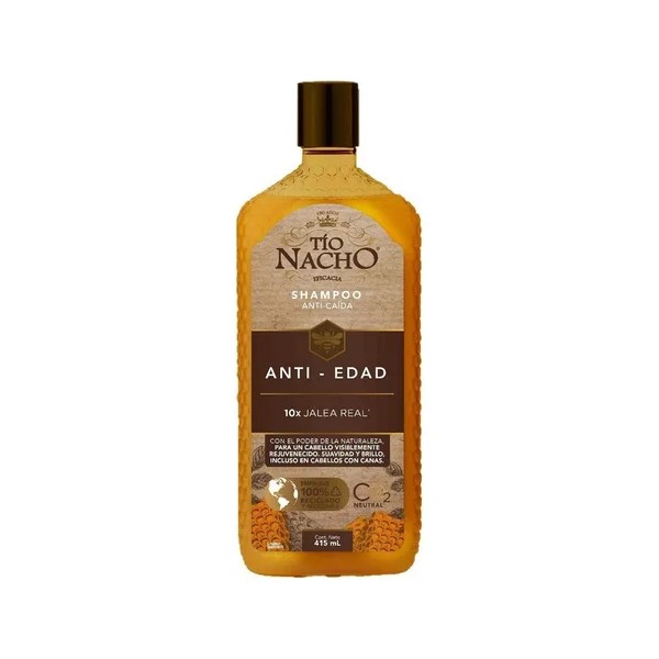 Tío Nacho renueva su imagen para brindarte un Cabello y Planeta más saludable. Prueba el poder del shampoo Tío Nacho Anti-edad y dale a tu cabello una apariencia más joven, visiblemente más saludable y suave. Con la eficacia del extracto de varios de los productos totalmente naturales que ayudan a la salud capilar. Nuevo empaque 100% reciclado y reciclable.