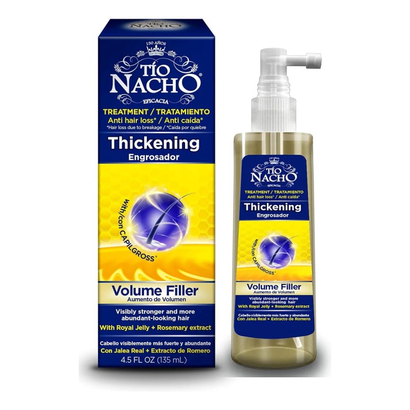 Tío Nacho Tratamiento de Relleno de Volumen Espesante con Jalea Real es un producto especialmente diseñado para darle cuerpo, densidad y volumen al cabello fino y sin vida. Su fórmula enriquecida con jalea real proporciona nutrientes esenciales que fortalecen el cabello desde la raíz, ayudando a rellenar y espesar cada hebra para lograr una melena más abundante y saludable.