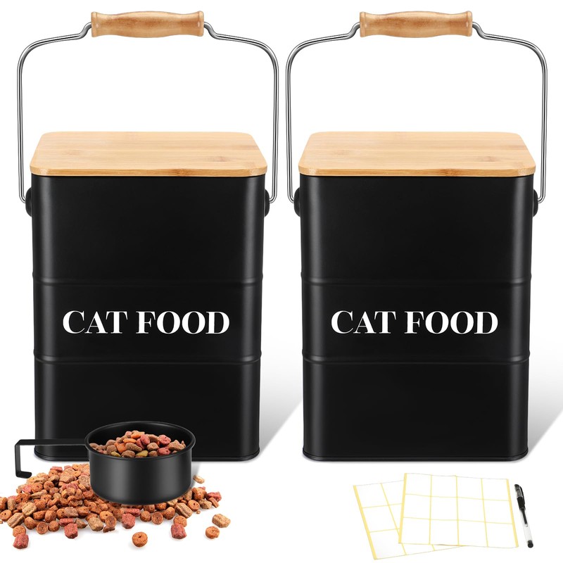 Tioncy 2 Pcs Metal Cat Food Containers with Bamboo Lids and Spoon Airtight 5-7 Lbs Cat Treat Snack Jars with DIY Labels Big Pet Cookie Storage Bin for Kitchen Counter(Black)