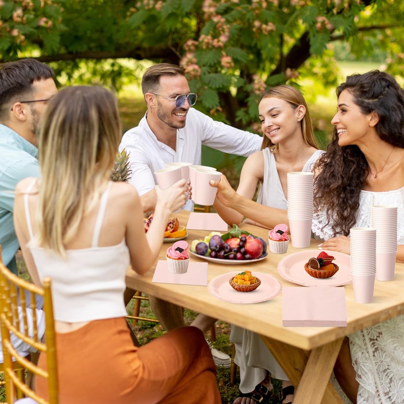 - Pastel Pink Comprehensive Set for 50 Guests: the blush color disposable dinnerware set includes 50 pieces of 7 inch plates, 50 pieces of 9 inch plates, 50 pieces of napkins, and 50 pieces of 9 Oz paper cups, a total of 200 pieces, catering to your party necessities for a gathering of 50 guests