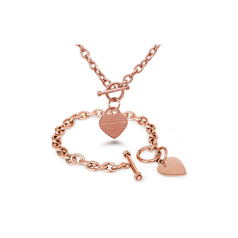 Tioneer Rose Gold Plated Stainless Steel Love Never Fails 1 Corinthians 13: 6-8 Heart Charm, Bracelet and Necklace Set