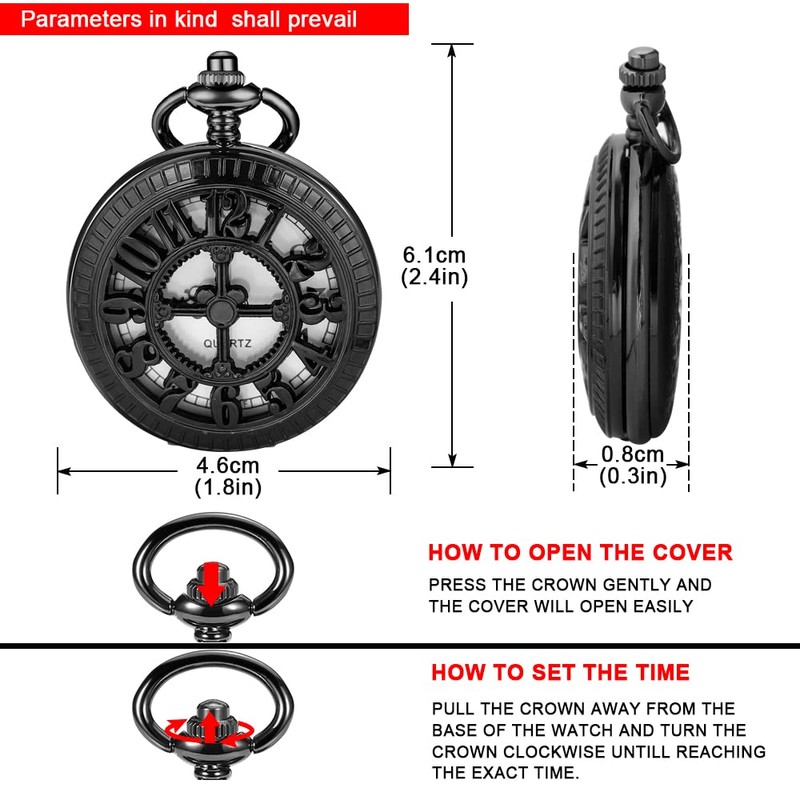 - Way to use & setting time: Press the watch top's crown, front plate will open.pull the crown away from the base of the watch and turn the crown clockwise until reaching the exact time, then press the crown back to its original position.