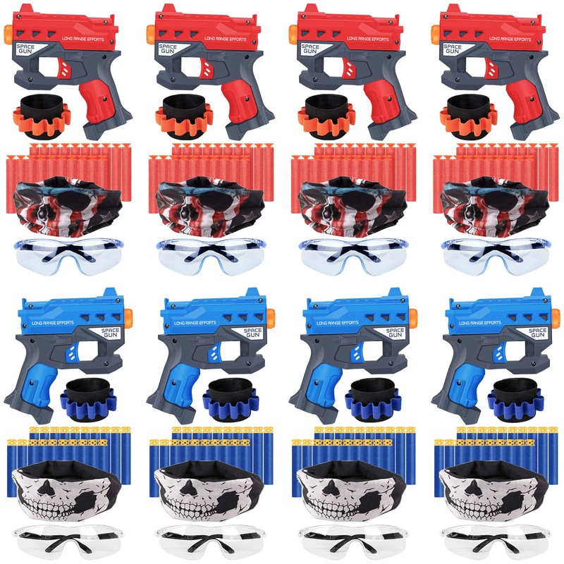 - 🔫Package List - You will receive 8 sets of toy gun sets, including 8 explosive energy guns (red/blue), 160 super soft foam bullets, 8 goggles, 8 masks and 8 wristbands. Children can enjoy starting gun games with their friends.