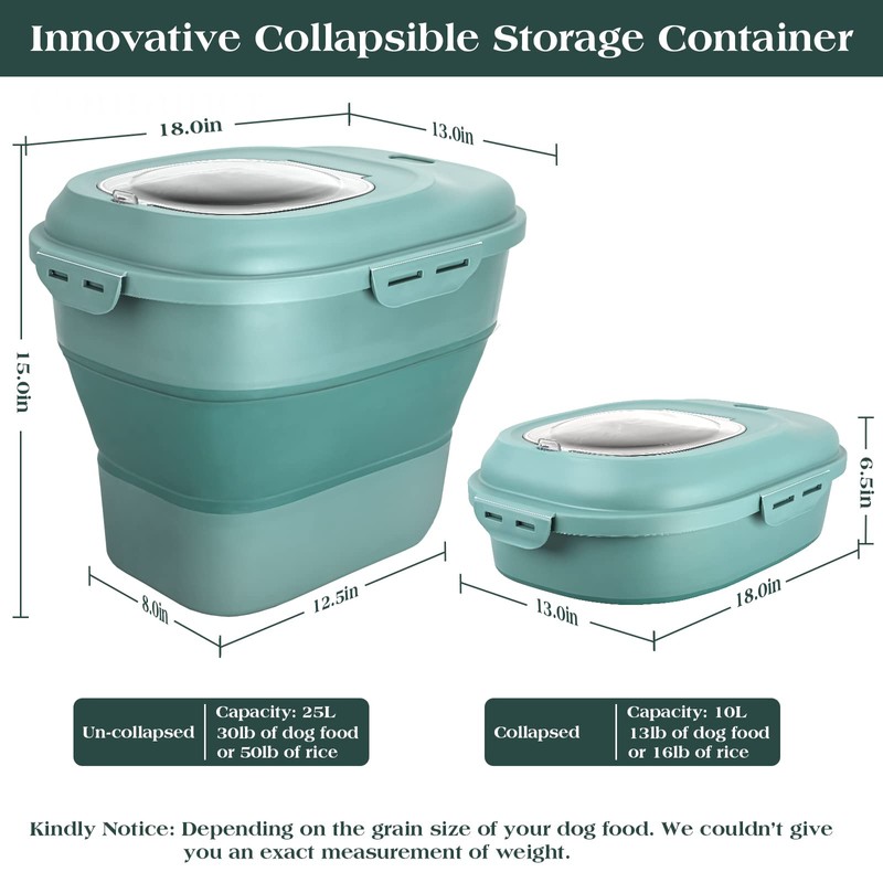 - Innovative Collapsible Storage Container: These pet food storage containers are easy to press it down to fold it up to keep food fresh and save your space or expand it to fit more. The container can handle about 30lbs of dog food. You can collapse it if you only use 13lbs of dog food. You can adjust the size as you need