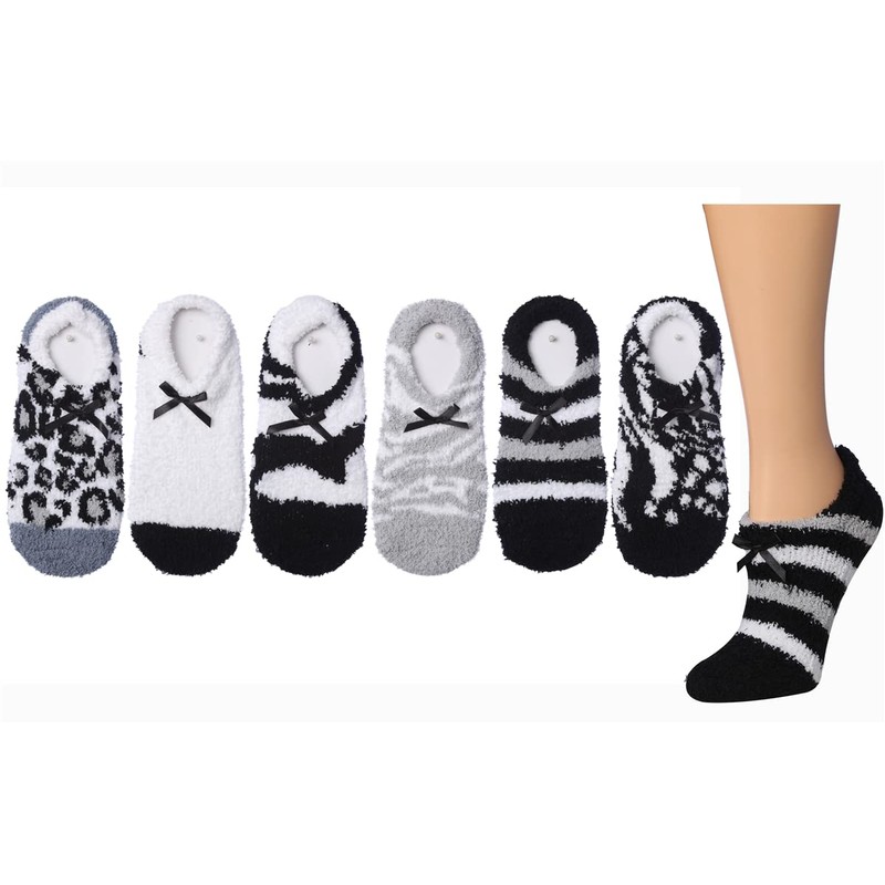 Tipi Toe Women's 6 Pairs Cozy Microfiber Anti-Skid Soft Leopard Cheetah Striped Pattern Black Grey White Colored Fuzzy Crew Socks, FZ36-T1
