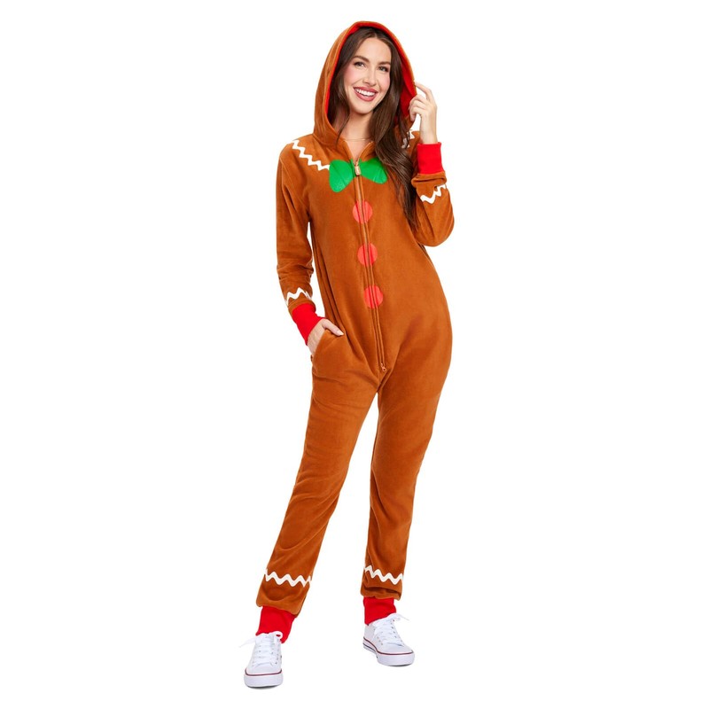 Tipsy Elves Christmas Onesies for Adults - Comfy Unisex Matching Holiday Jumpsuits with Convenient Pockets - Brown Gingerbread Christmas Jumpsuit Size X-Small