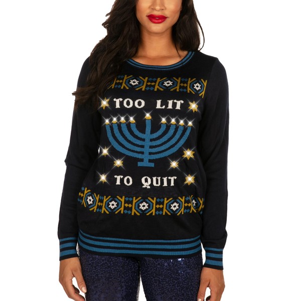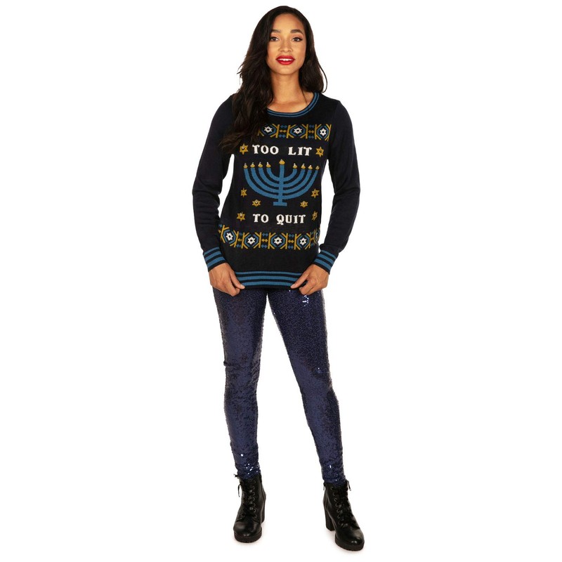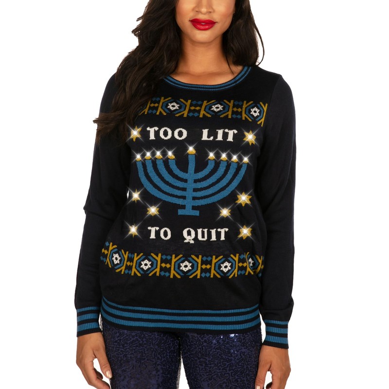 - Hazte con este suéter de Hanukkah con Tipsy Elves Too Lit to Quit Christmas para mujer. Este suéter azul y dorado añade un toque de calle a las celebraciones familiares más tradicionales.