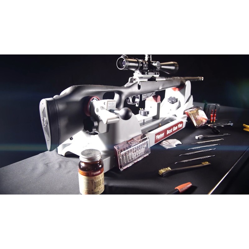 Part of Tipton's line of gun-cleaning supplies, this vise was designed to accommodate the widest possible array of firearms for cleaning, maintenance, or gunsmithing, and is easily configurable to handle bolt-action rifles, break-open shotguns, AR-15s, and handguns. A central aluminum channel lets the user move individual components to the ideal position for their firearm. Each individual component then adjusts to the perfect position for secure support. The rear base features two adjustable offset clamps for a tight grip on a wide range of buttstock configurations.