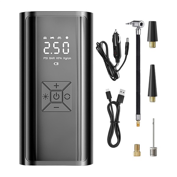 This portable air compressor is a companion for inflating tires on cars, bikes, motorcycles, trucks, and RVs. Featuring electric, cordless operations and a rechargeable design, it has convenience and mobility.