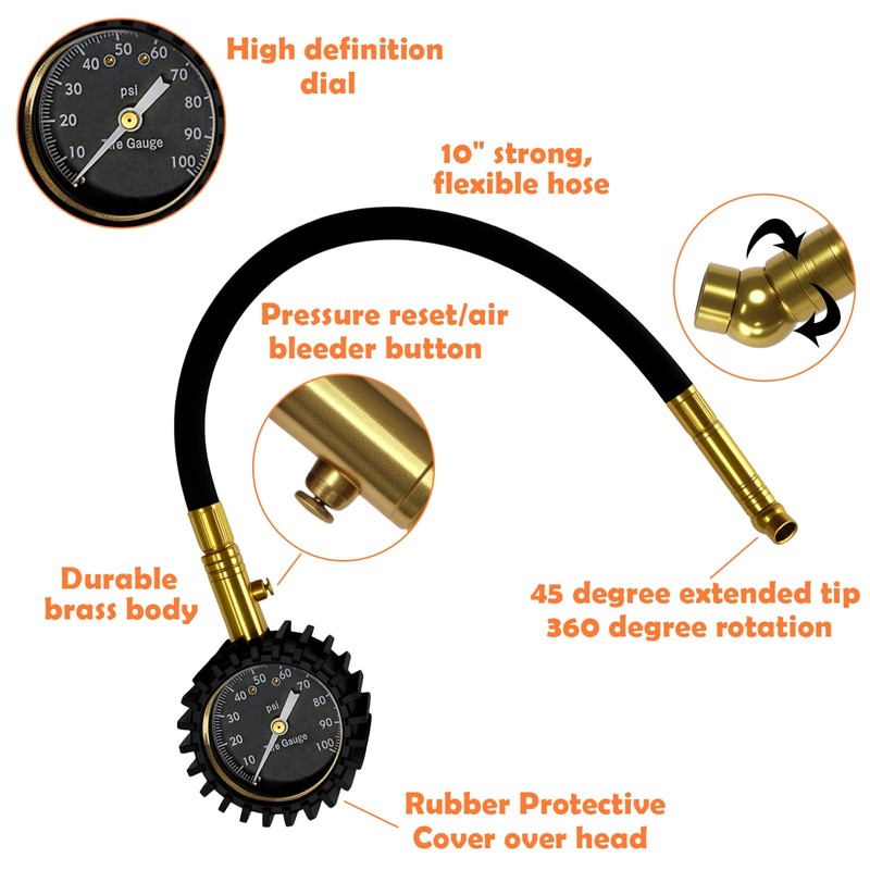 - 【Quick Release】The sturdy design is equipped with an internal exhaust valve, which is used to reduce the pressure inside over-inflated tires. Moreover, this convenient 360-degree rotating chuck can easily access the tire valve from any angle.