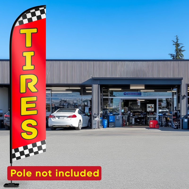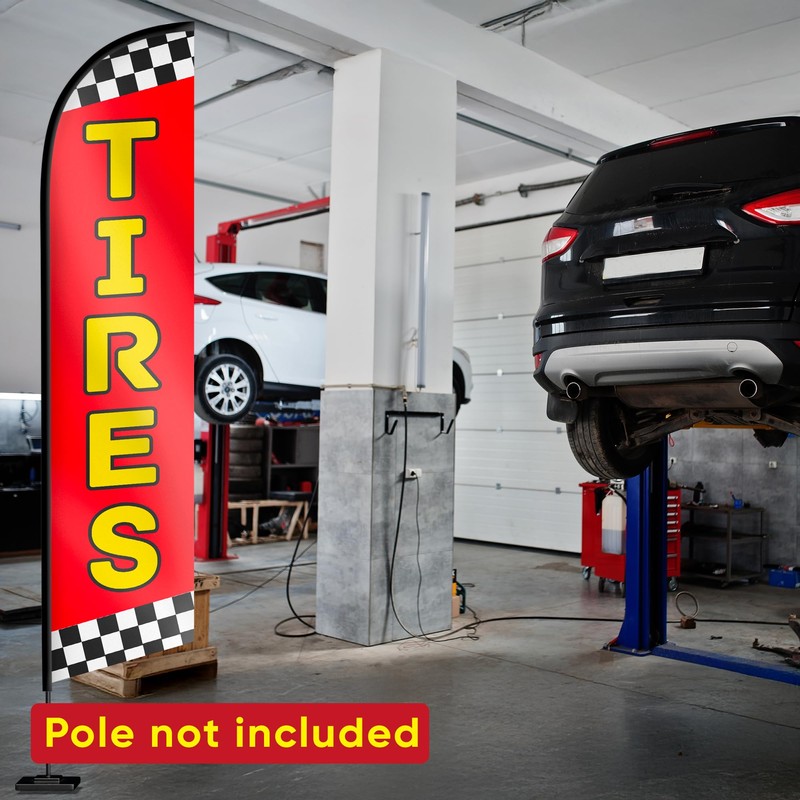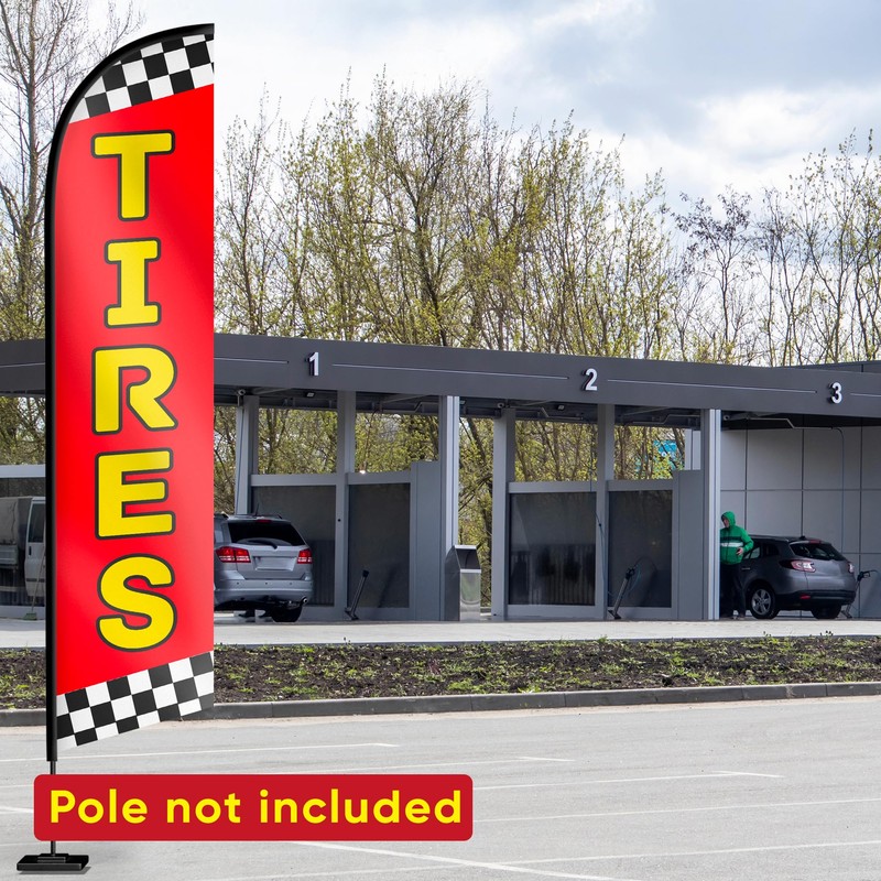 Tires Feather Flag - Advertising Flags - Tire for Sale Business Banner Ideal for Auto Repair Shops, Mechanics, Car Dealerships and Auto Body Shops 12ft x 2.5ft (Pole not included)
