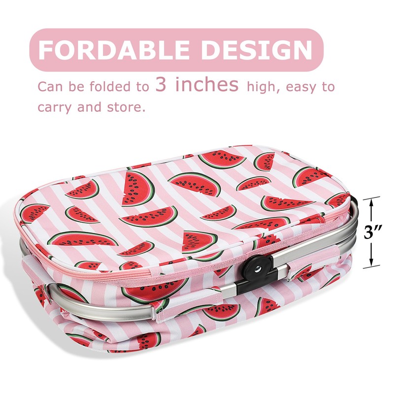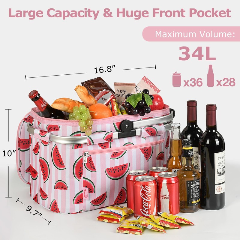 Tirrinia Large Insulated Picnic Basket, 34L Water Resistant & Leakproof Collapsible Portable Cooler Basket Set with Aluminium Handle for Travel, with a Free Foldable Grocery Bag, Pink