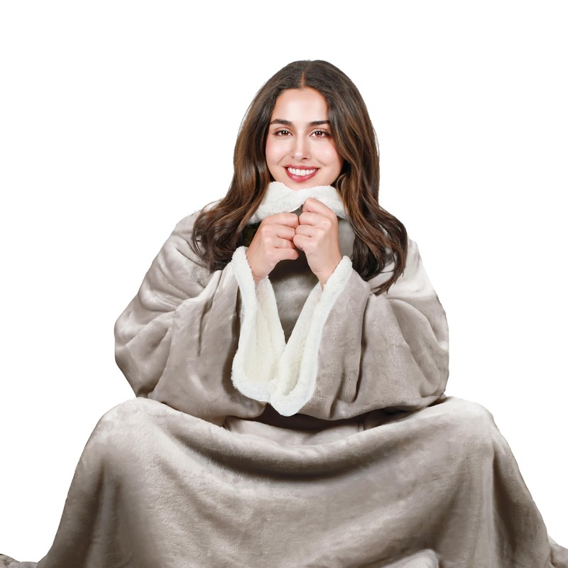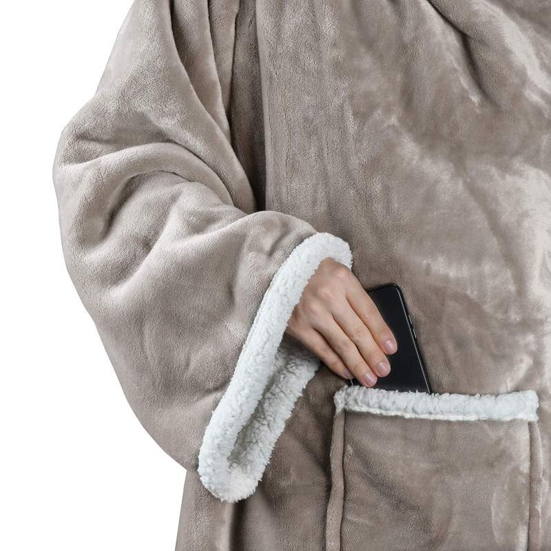 Micro mink fleece sherpa wearable blanket with sleeves covers shoulders, arms and keep hands free, will not slip down