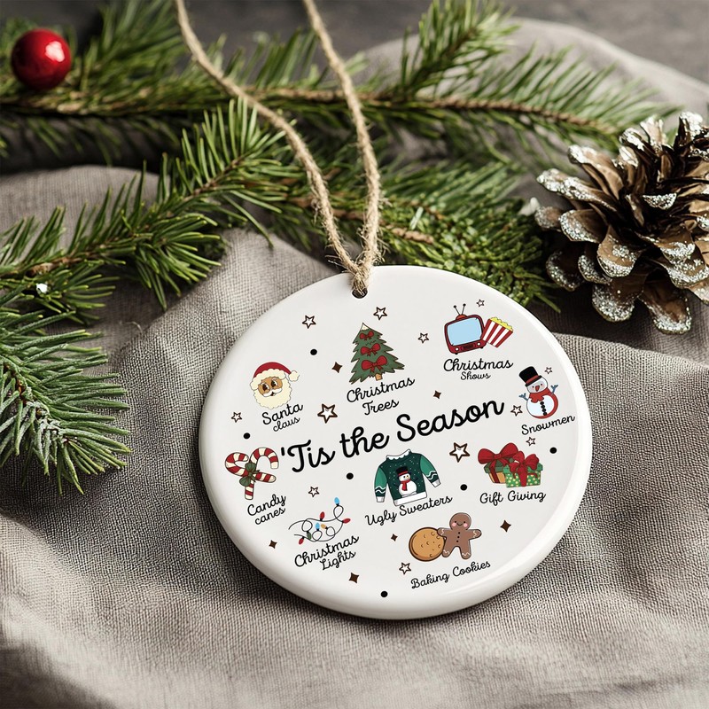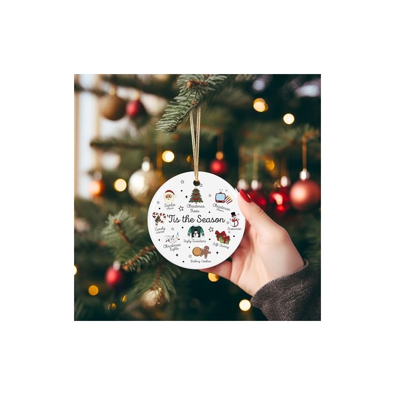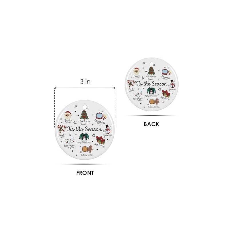 - Festive Design: This 3-inch round ornament features a delightful Christmas-themed design with icons representing Santa, Christmas trees, Christmas shows, candy canes, ugly sweaters, Christmas lights, gift-giving, baking cookies, and a snowman.